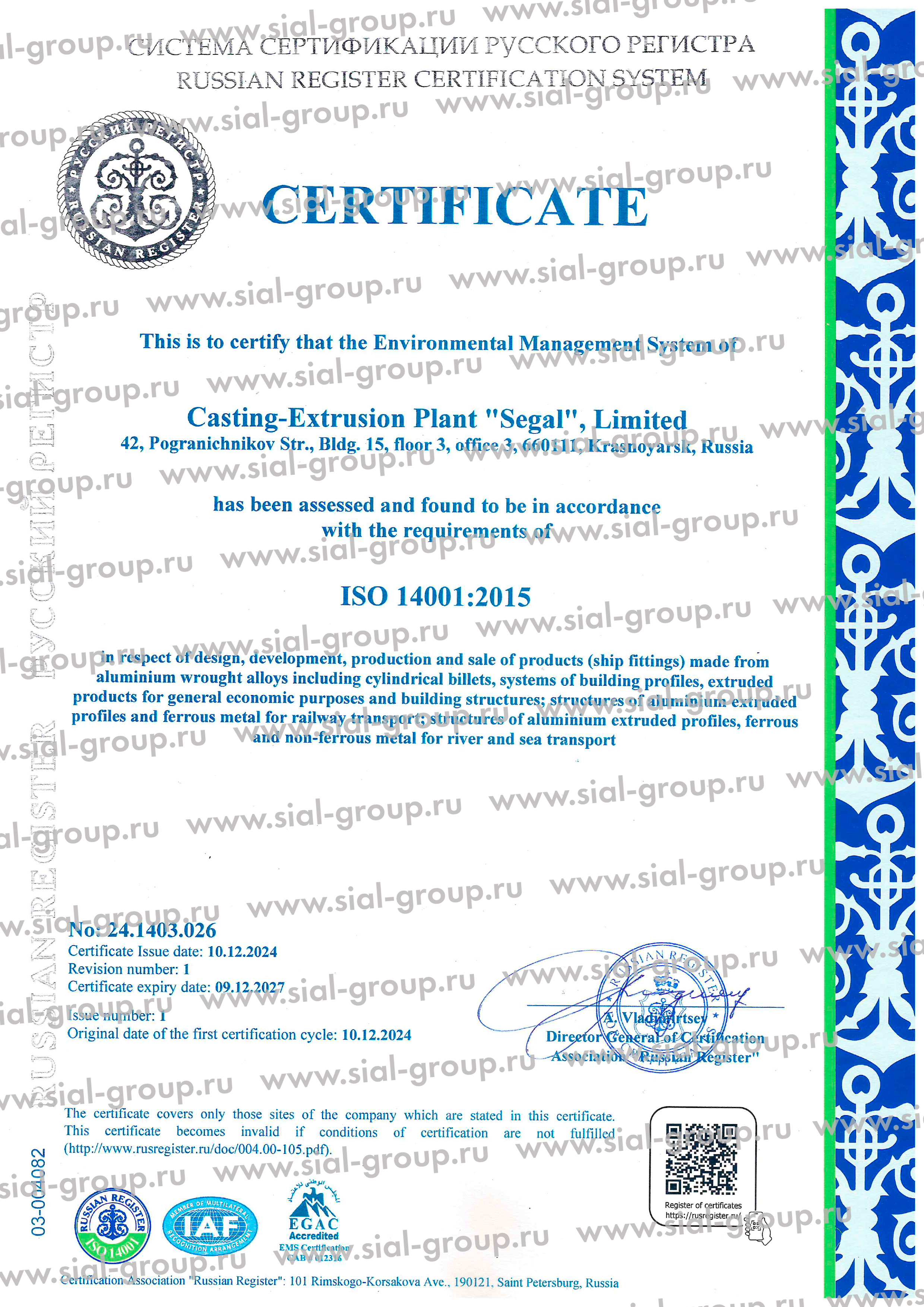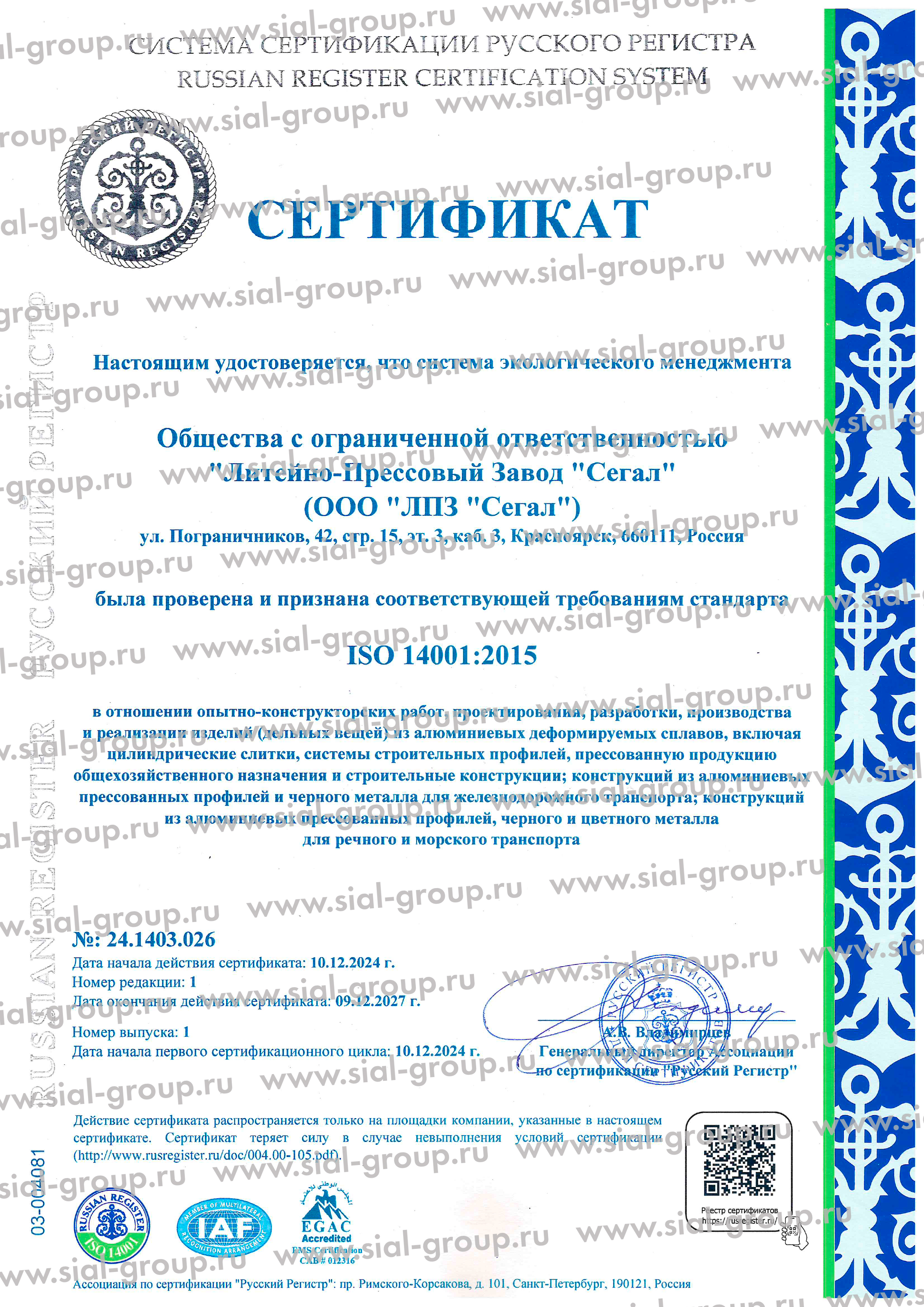 2018Сертификат соответствия системы экологического менеджмента ISO 14001:2015